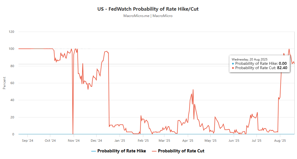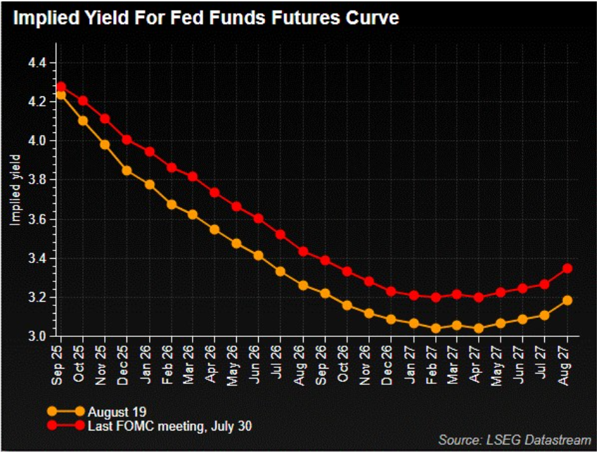 除了政治壓力,市場更關注鮑威爾在此次年會上是否會釋放9 月降息訊號。目前,美國通膨雖低於兩年前高位,但仍比聯準會2% 的目標高出約1 個百分點;失業率則維持在4.2% 的歷史低位,處於美聯儲「物價穩定與充分就業」 雙重使命的微妙平衡點。投資者對降息的押注已相當激進。利率期貨交易員定價顯示,9 月降息25 個基點的機率高達85%,並預計年底前再降25 個基點。