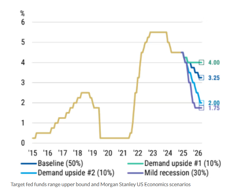 To further examine the likelihood of interest rate paths, the Morgan Stanley team analyzed three alternative scenarios: