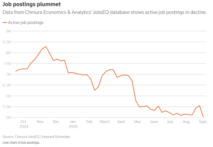 關鍵指標承壓: 8 月失業率上升至4.3%,6 月職缺流失,2025 年前一年新增職缺較初報少近100 萬人。