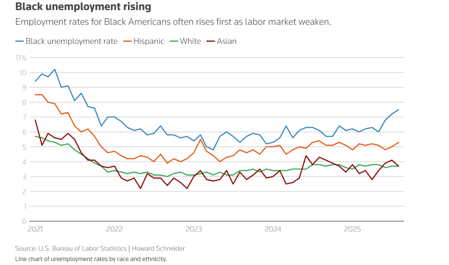 結構問題凸顯:產業招募範圍收窄,黑人失業率自2025 年2 月飆升(與白人分化),職缺年減超7%(較2023 年降27.1%)。