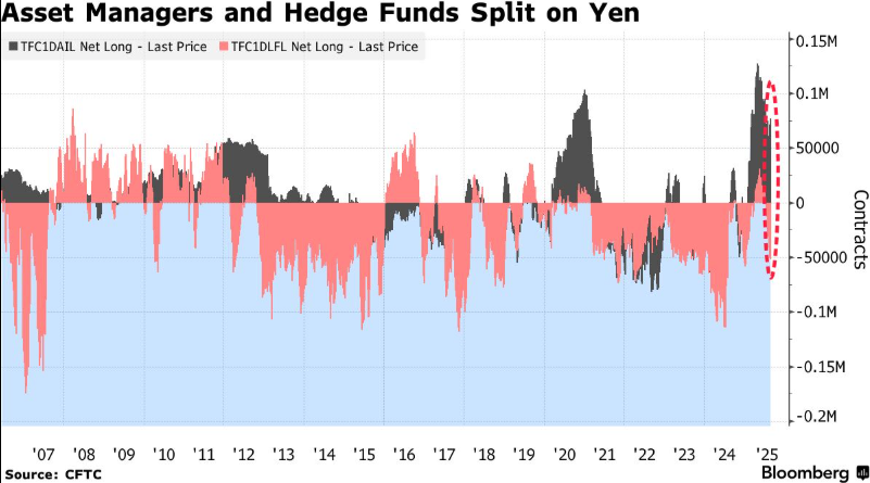 當前日圓市場的核心矛盾,源自於“避險屬性弱化” 與“日本央行政策路徑模糊”,引發多空分歧達近年罕見程度。 CFTC 數據顯示,截至9 月16 日當週(日本央行利率決議前),對沖基金看跌日元淨頭寸增至58811 份合約,資產管理公司仍持有71162 份多單,雙方持倉分化創2012 年以來新高,差距逼近2007 年極值。