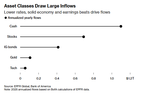 According to Bank of America's annualized estimates based on EPFR Global data, stocks, cash, gold, and investment-grade bonds will all lead the way in terms of inflows in 2025. Equity funds are expected to see inflows of $693 billion, ranking third on record; cash funds are projected to attract $1.1 trillion, second highest on record; gold and investment-grade bonds are projected to receive $108 billion and $415 billion, respectively, both record highs.